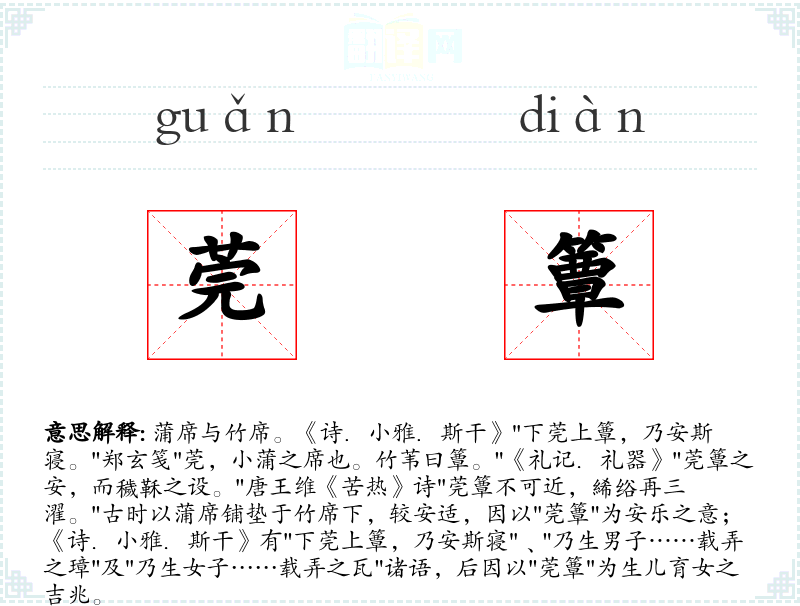 蒲席与竹席。《诗.小雅.斯干》"下莞上簟,乃安斯寝。"郑玄笺"莞,小蒲之席也。竹苇曰簟。"《礼记.礼器》"莞簟之安,而穢鞂之设。"唐王维《苦热》诗"莞簟不可近,絺绤再三濯。"古时以蒲席铺垫于竹席下,较安适,因以"莞簟"为安乐之意; 《诗.小雅.斯干》有"下莞上簟,乃安斯寝"﹑"乃生男子……载弄之璋"及"乃生女子……载弄之瓦"诸语,后因以"莞簟"为生儿育女之吉兆。