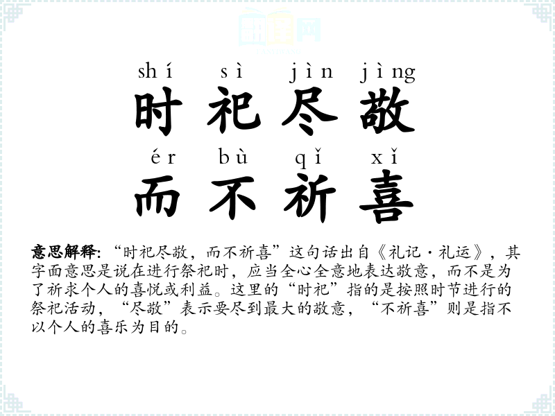 “时祀”一词源自古代的祭祀*俗,随着时间的推移,其含义逐渐固定为按照时节进行的祭祀活动。“尽敬”和“不祈喜”则体现了儒家文化中对礼仪和道德的重视。