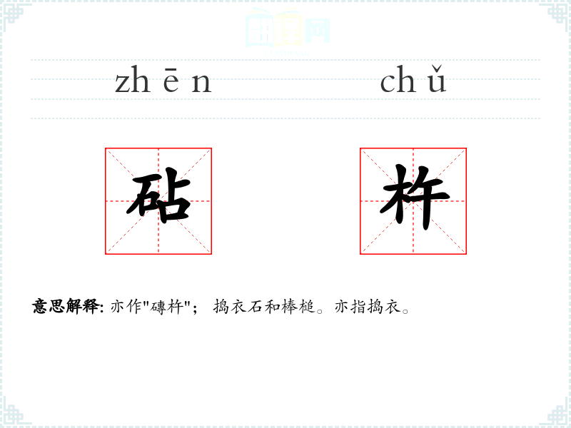 亦作"磚杵"; 捣衣石和棒槌。亦指捣衣。