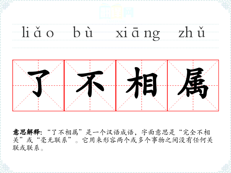 “了不相属”是一个汉语成语,字面意思是“完全不相关”或“毫无联系”。它用来形容两个或多个事物之间没有任何关联或联系。