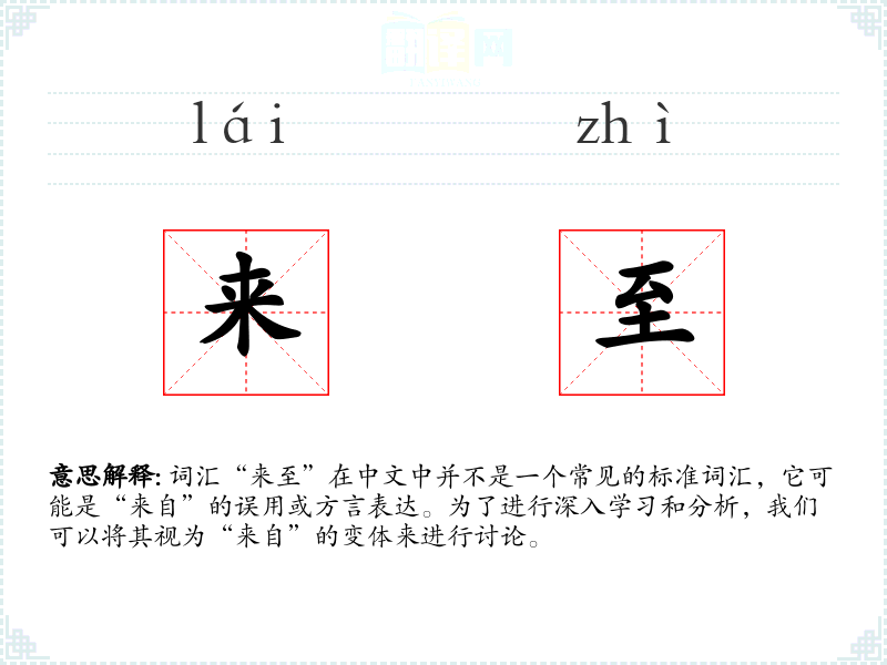 词汇“来至”在中文中并不是一个常见的标准词汇,它可能是“来自”的误用或方言表达。为了进行深入学*和分析,我们可以将其视为“来自”的变体来进行讨论。