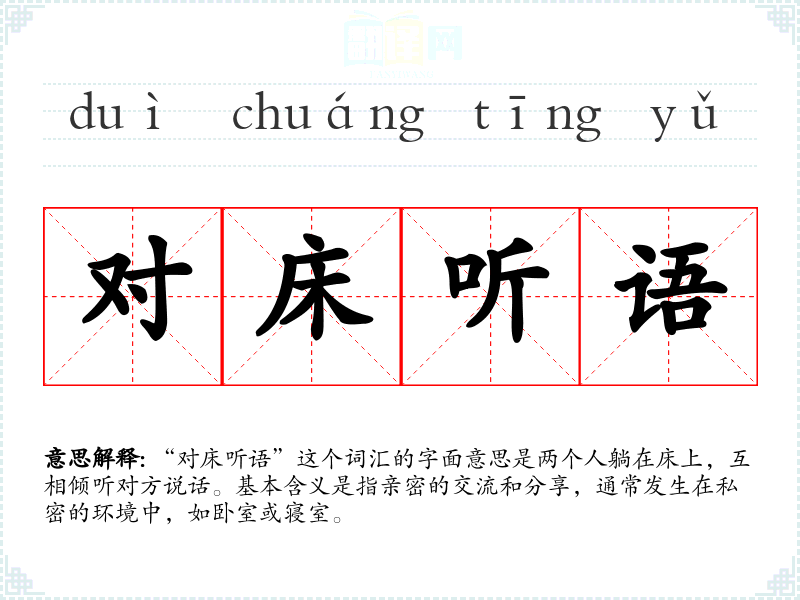 “对床听语”这个词汇的字面意思是两个人躺在床上,互相倾听对方说话。基本含义是指亲密的交流和分享,通常发生在私密的环境中,如卧室或寝室。