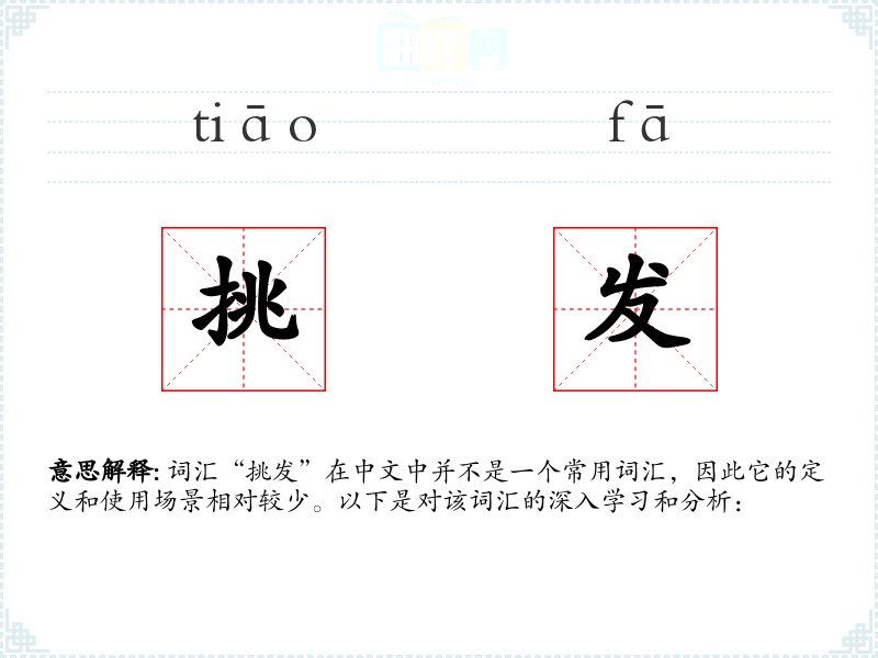 词汇“挑发”在中文中并不是一个常用词汇,因此它的定义和使用场景相对较少。以下是对该词汇的深入学*和分析: