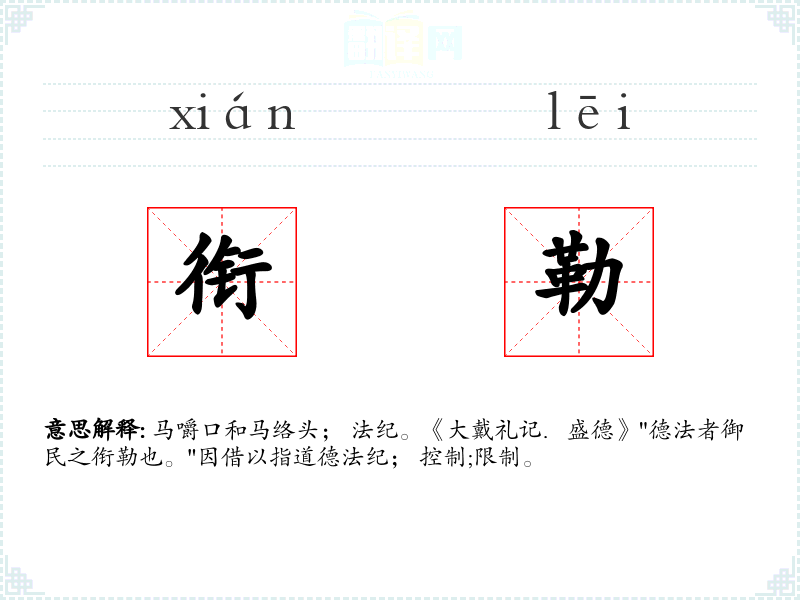 马嚼口和马络头; 法纪。《大戴礼记.盛德》"德法者御民之衔勒也。"因借以指道德法纪; 控制;限制。