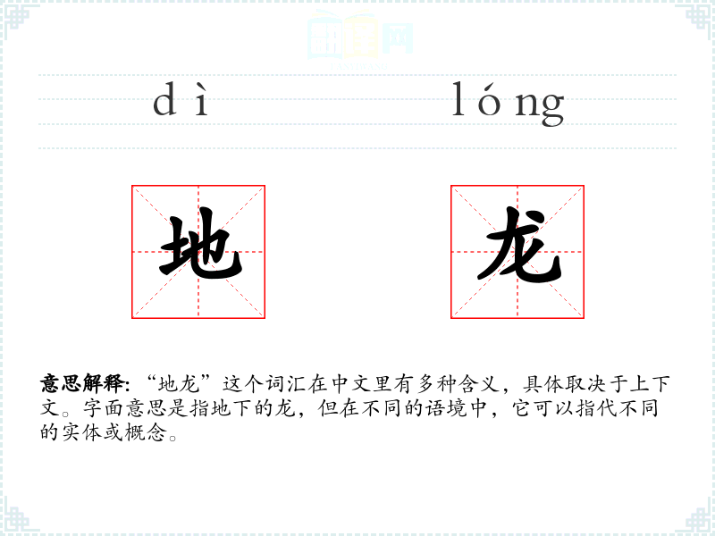 - 口语:在日常口语中,“地龙”可能被用来形容某种强大的地下生物或现象。