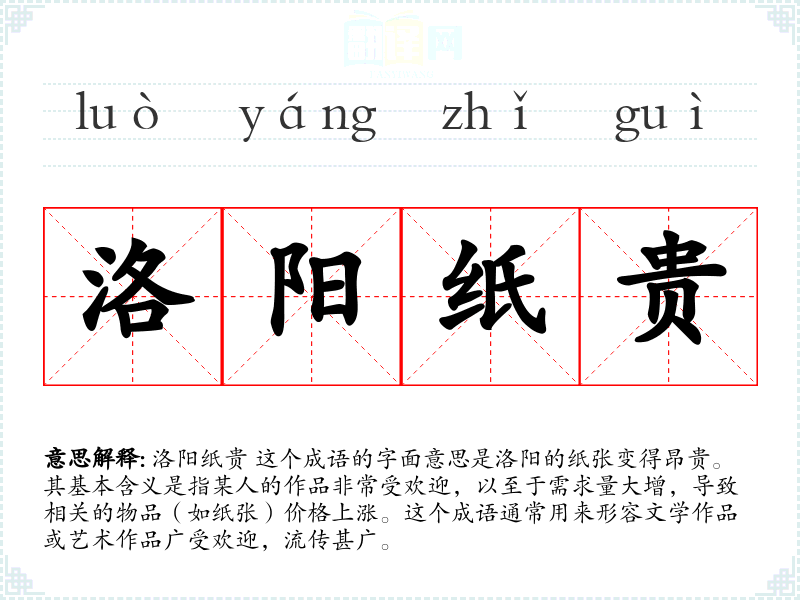 洛阳纸贵 这个成语的字面意思是洛阳的纸张变得昂贵。其基本含义是指某人的作品非常受欢迎,以至于需求量大增,导致相关的物品(如纸张)价格上涨。这个成语通常用来形容文学作品或艺术作品广受欢迎,流传甚广。