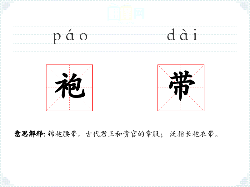 锦袍腰带。古代君王和贵官的常服; 泛指长袍衣带。