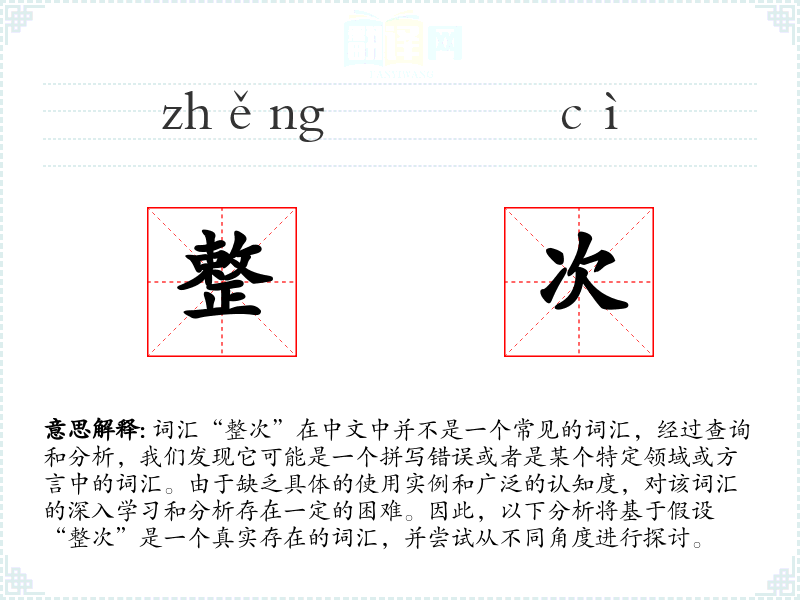 词汇“整次”在中文中并不是一个常见的词汇,经过查询和分析,我们发现它可能是一个拼写错误或者是某个特定领域或方言中的词汇。由于缺乏具体的使用实例和广泛的认知度,对该词汇的深入学习和分析存在一定的困难。因此,以下分析将基于假设“整次”是一个真实存在的词汇,并尝试从不同角度进行探讨。