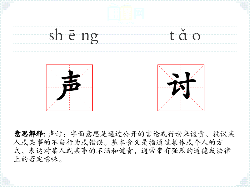 声讨:字面意思是通过公开的言论或行动来谴责、抗议某人或某事的不当行为或错误。基本含义是指通过集体或个人的方式,表达对某人或某事的不满和谴责,通常带有强烈的道德或法律上的否定意味。