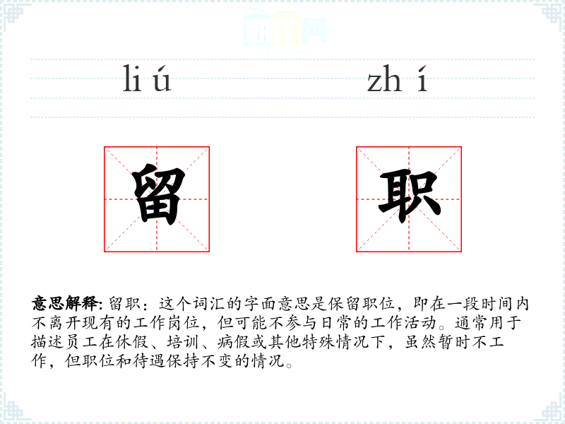 留职:这个词汇的字面意思是保留职位,即在一段时间内不离开现有的工作岗位,但可能不参与日常的工作活动。通常用于描述员工在休假、培训、病假或其他特殊情况下,虽然暂时不工作,但职位和待遇保持不变的情况。