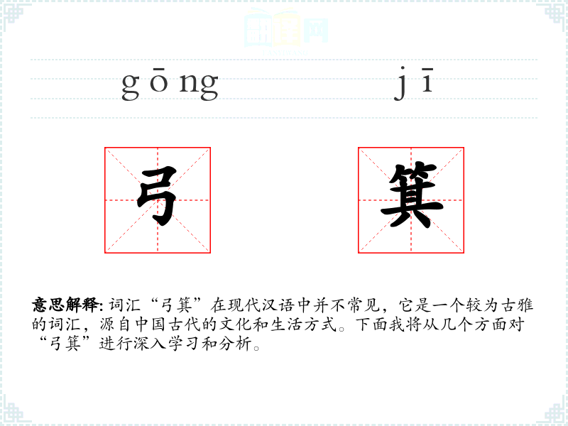 “弓箕”由两个字组成:“弓”和“箕”。“弓”指的是一种用于射箭的弯曲的武器,而“箕”则是指一种用来簸扬谷物、去除杂质的器具,形状像簸箕。在古代,“弓箕”常用来比喻武士和农夫,即武和农,代表了古代社会的两大基本职业。