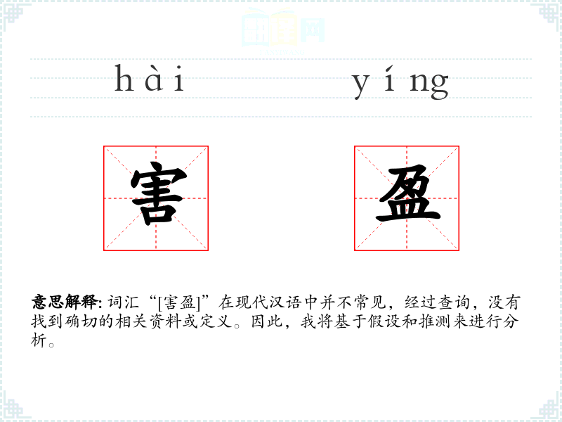 词汇“[害盈]”在现代汉语中并不常见,经过查询,没有找到确切的相关资料或定义。因此,我将基于假设和推测来进行分析。