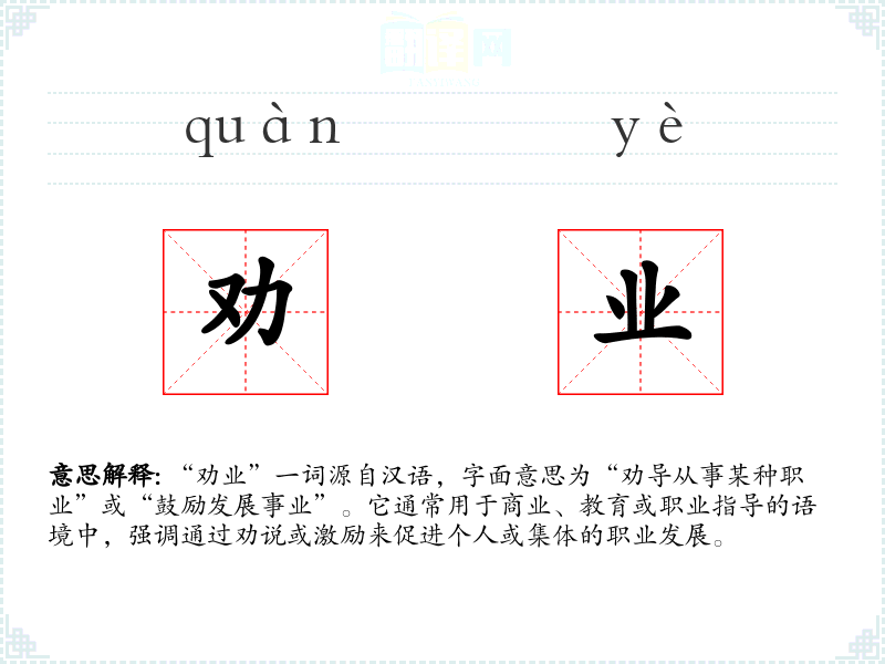 - 专业领域:在职业咨询或教育领域,“劝业”可能特指提供职业规划和指导服务。
