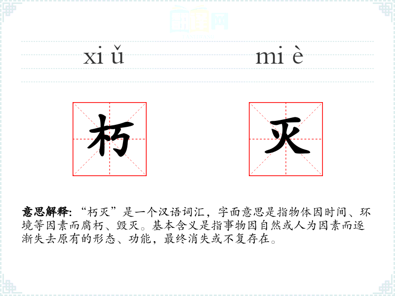 - 口语:在日常口语中,“朽灭”可能不常直接使用,但可以用“腐烂”、“消失”等词汇替代。