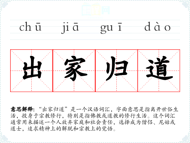 在西方文化中,类似的词汇可能是“enter the priesthood”或“take vows”,这些词汇也描述了类似的选择,即放弃世俗生活,投身于**服务。然而,这些词汇在语境和情感色彩上可能与“出家归道”有所不同。
