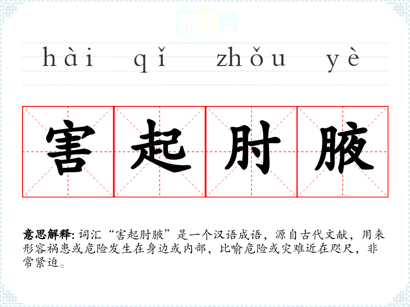 词汇“害起肘腋”是一个汉语成语,源自古代文献,用来形容祸患或危险发生在身边或内部,比喻危险或灾难近在咫尺,非常紧迫。