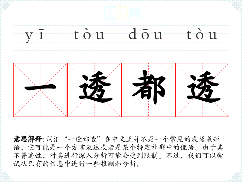 “一透都透”作为一个不常见的表达,其具体含义和使用场景需要更多的上下文信息来确定。在语言学习和表达中,了解和掌握多样化的表达方式是有益的,但同时也需要注意表达的准确性和普遍性。