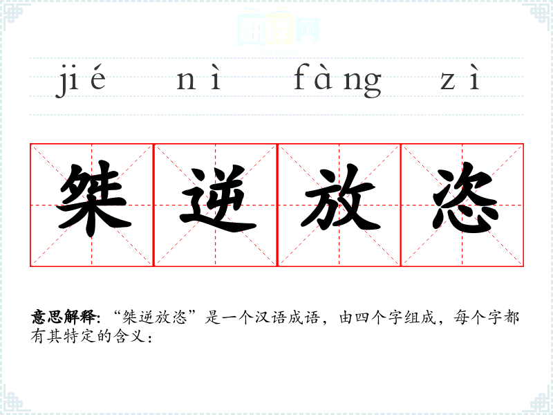 “桀逆放恣”是一个汉语成语,由四个字组成,每个字都有其特定的含义: