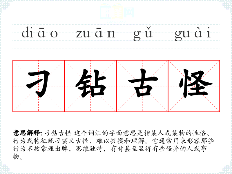 刁钻古怪 这个词汇的字面意思是指某人或某物的性格、行为或特征既刁蛮又古怪,难以捉摸和理解。它通常用来形容那些行为不按常理出牌,思维独特,有时甚至显得有些怪异的人或事物。