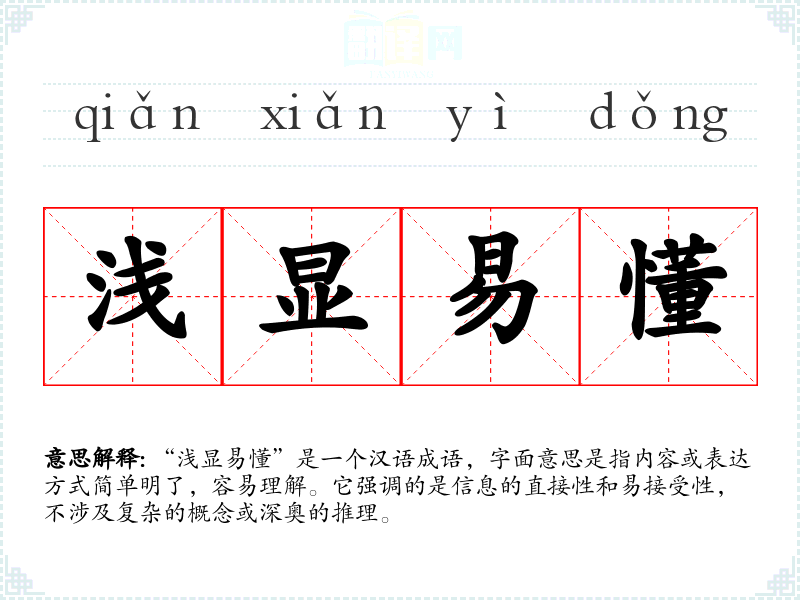 “浅显易懂”是一个汉语成语,字面意思是指内容或表达方式简单明了,容易理解。它强调的是信息的直接性和易接受性,不涉及复杂的概念或深奥的推理。