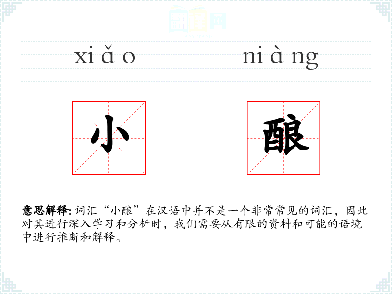 词汇“小酿”在汉语中并不是一个非常常见的词汇,因此对其进行深入学*和分析时,我们需要从有限的资料和可能的语境中进行推断和解释。
