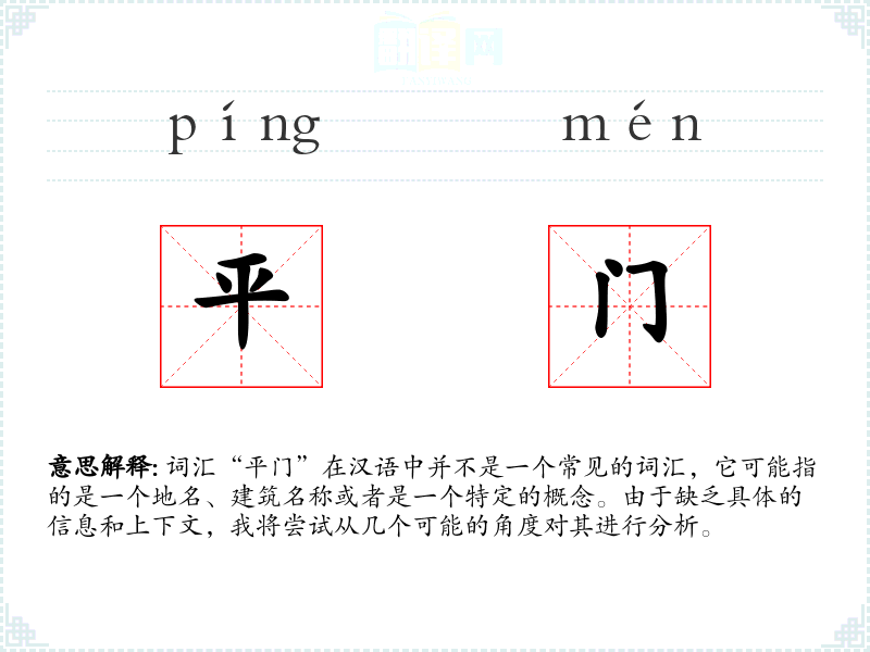 词汇“平门”在汉语中并不是一个常见的词汇,它可能指的是一个地名、建筑名称或者是一个特定的概念。由于缺乏具体的信息和上下文,我将尝试从几个可能的角度对其进行分析。