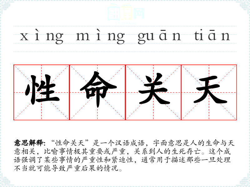在英语中,类似的表达可能是“life-and-death matter”,虽然意思相近,但“性命关天”更具有**文化的特色和深远的哲学意味。