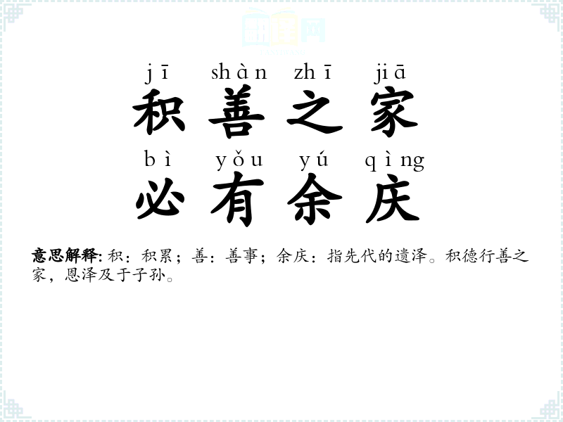 积:积累;善:善事;余庆:指先代的遗泽。积德行善之家,恩泽及于子孙。