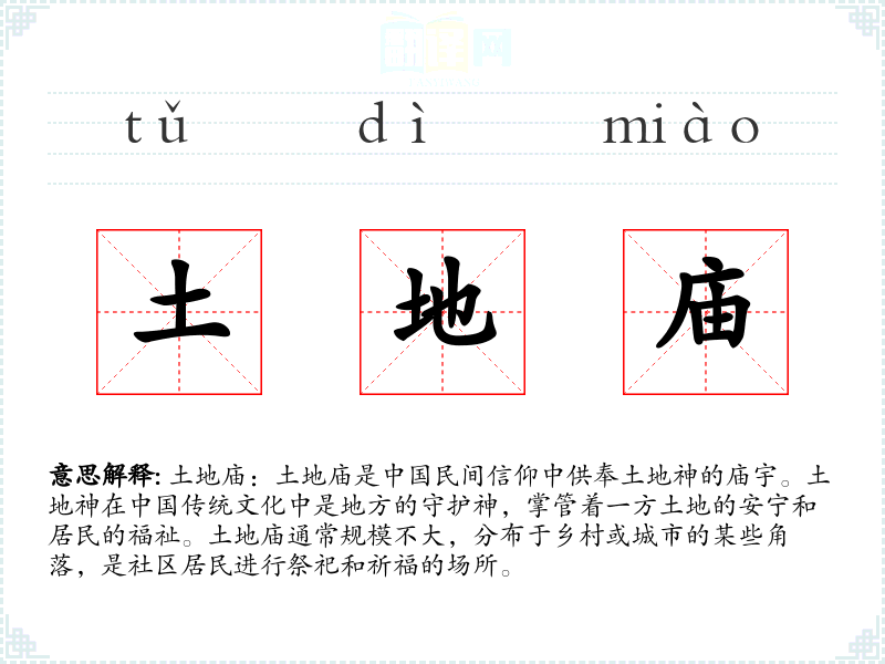 - 细微差别:这些词汇都指供奉土地神的庙宇,但在不同地区或方言中可能有所区别。