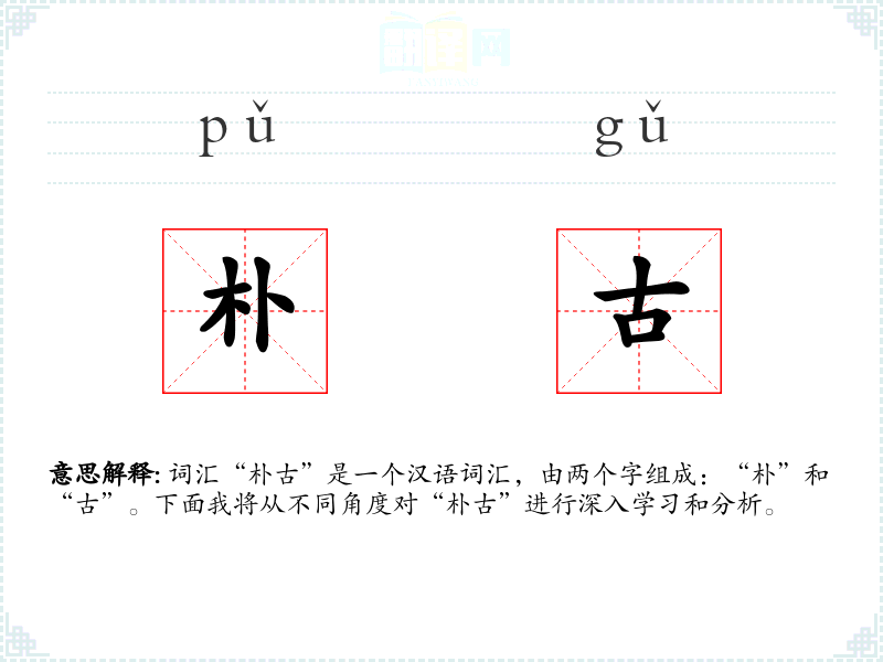 - 词源:“朴”和“古”都是古代汉语中常用的词汇,“朴”源自《说文解字》中的“朴,木素也”,“古”则源自“古,久也”。