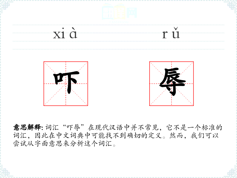 词汇“吓辱”在现代汉语中并不常见,它不是一个标准的词汇,因此在中文词典中可能找不到确切的定义。然而,我们可以尝试从字面意思来分析这个词汇。