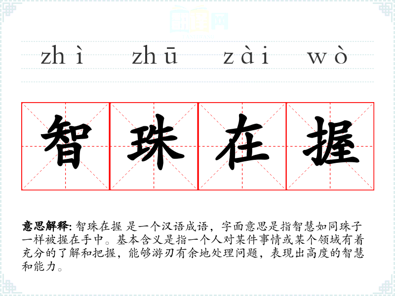 智珠在握 是一个汉语成语,字面意思是指智慧如同珠子一样被握在手中。基本含义是指一个人对某件事情或某个领域有着充分的了解和把握,能够游刃有余地处理问题,表现出高度的智慧和能力。