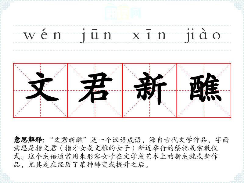 在**传统文化中,女性文人和艺术家常常被赋予特殊的地位和赞美。因此,“文君新醮”这个成语反映了社会对女性在文学和艺术领域成就的认可和尊重。
