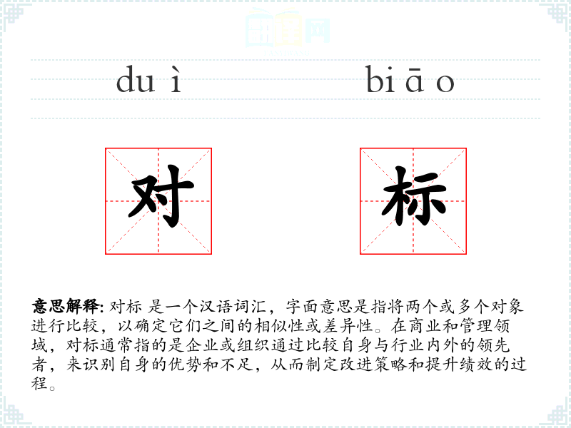 对标 是一个汉语词汇,字面意思是指将两个或多个对象进行比较,以确定它们之间的相似性或差异性。在商业和管理领域,对标通常指的是企业或组织通过比较自身与行业内外的领先者,来识别自身的优势和不足,从而制定改进策略和提升绩效的过程。