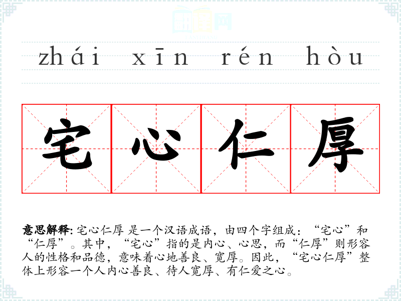 宅心仁厚 是一个汉语成语,由四个字组成:“宅心”和“仁厚”。其中,“宅心”指的是内心、心思,而“仁厚”则形容人的性格和品德,意味着心地善良、宽厚。因此,“宅心仁厚”整体上形容一个人内心善良、待人宽厚、有仁爱之心。