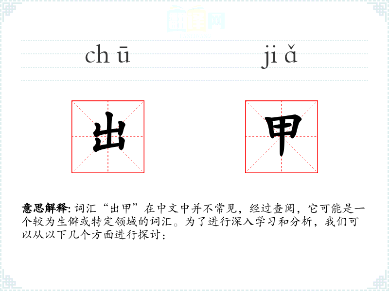 词汇“出甲”在中文中并不常见,经过查阅,它可能是一个较为生僻或特定领域的词汇。为了进行深入学*和分析,我们可以从以下几个方面进行探讨: