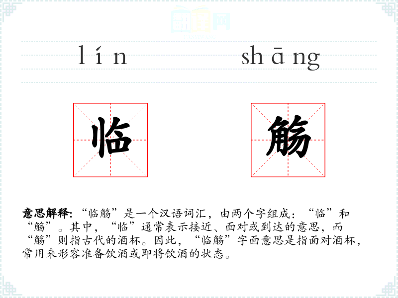 “临觞”是一个汉语词汇,由两个字组成:“临”和“觞”。其中,“临”通常表示接近、面对或到达的意思,而“觞”则指古代的酒杯。因此,“临觞”字面意思是指面对酒杯,常用来形容准备饮酒或即将饮酒的状态。