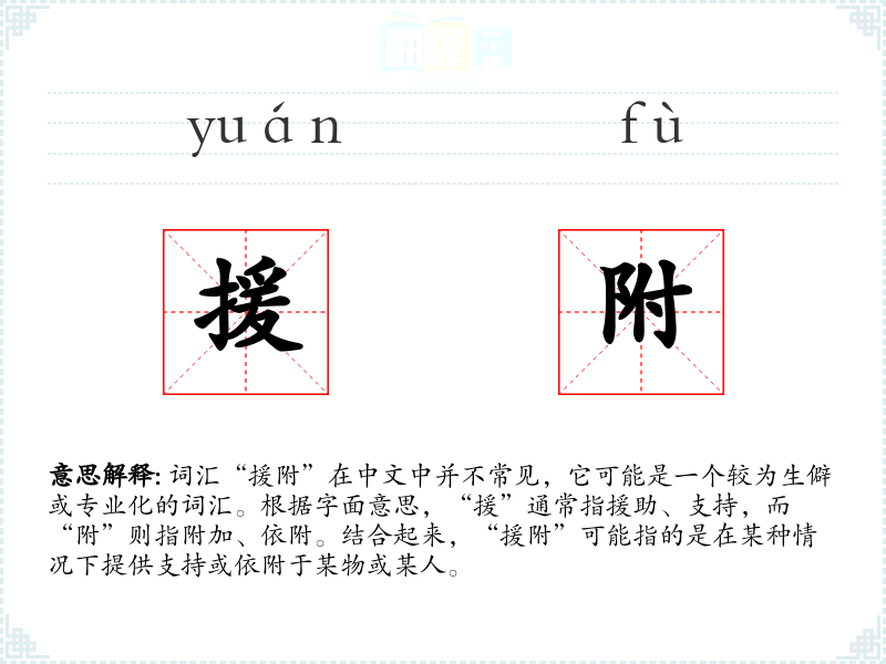 - “援附”是一个具有特定语境和专业性的词汇,虽然在日常交流中不常见,但在特定领域和文学作品中具有其独特的表达效果。了解和掌握这样的词汇有助于丰富语言表达的层次和深度。