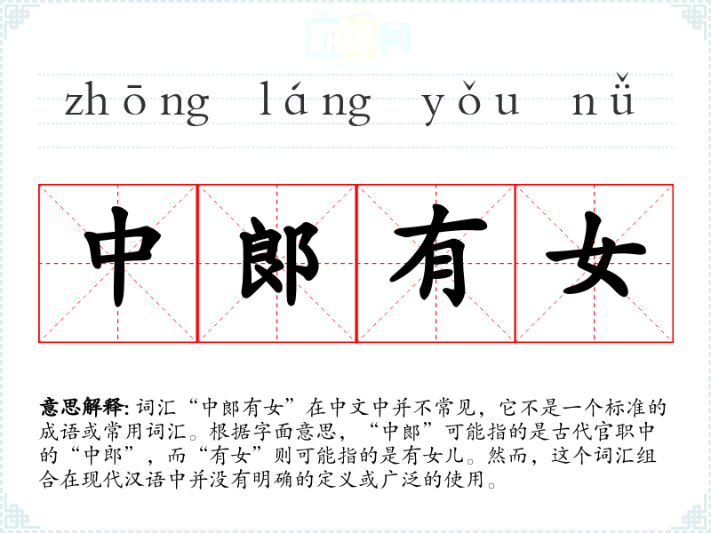 由于“中郞有女”不是一个标准的词汇,我们无法提供一个确切的基本定义。它可能是某个特定文学作品或方言中的表达,但在标准汉语中并不常见。