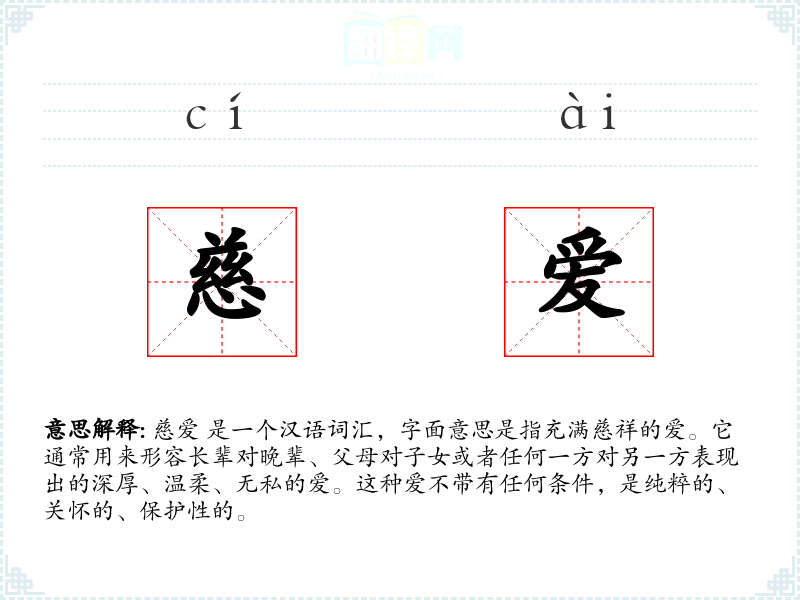 慈爱 是一个汉语词汇,字面意思是指充满慈祥的爱。它通常用来形容长辈对晚辈、父母对子女或者任何一方对另一方表现出的深厚、温柔、无私的爱。这种爱不带有任何条件,是纯粹的、关怀的、保护性的。
