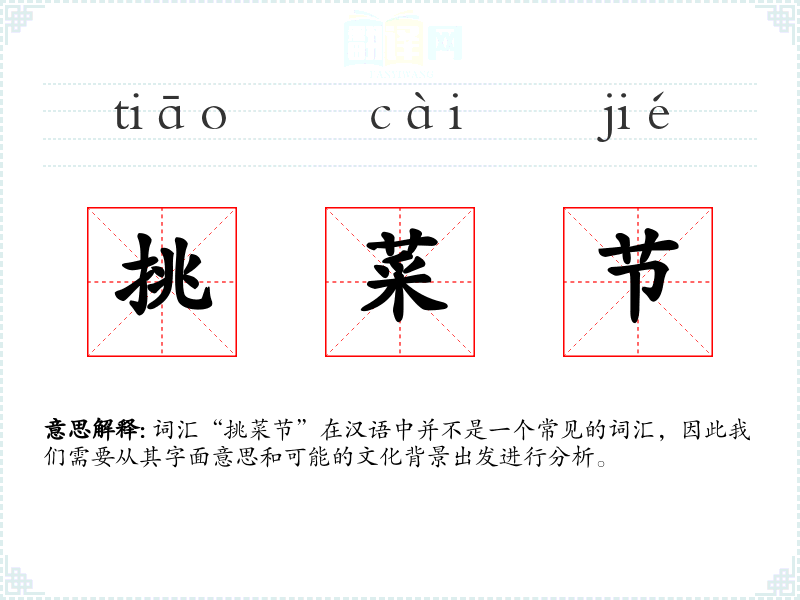 词汇“挑菜节”在汉语中并不是一个常见的词汇,因此我们需要从其字面意思和可能的文化背景出发进行分析。