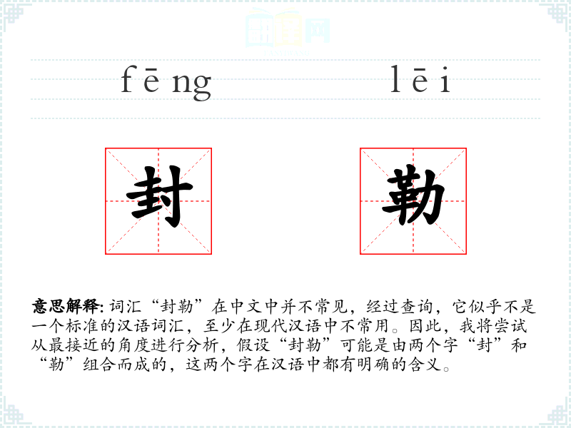词汇“封勒”在中文中并不常见,经过查询,它似乎不是一个标准的汉语词汇,至少在现代汉语中不常用。因此,我将尝试从最接近的角度进行分析,假设“封勒”可能是由两个字“封”和“勒”组合而成的,这两个字在汉语中都有明确的含义。