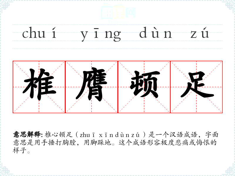 椎心顿足(zhuī xīn dùn zú)是一个汉语成语,字面意思是用手捶打胸膛,用脚跺地。这个成语形容极度悲痛或悔恨的样子。