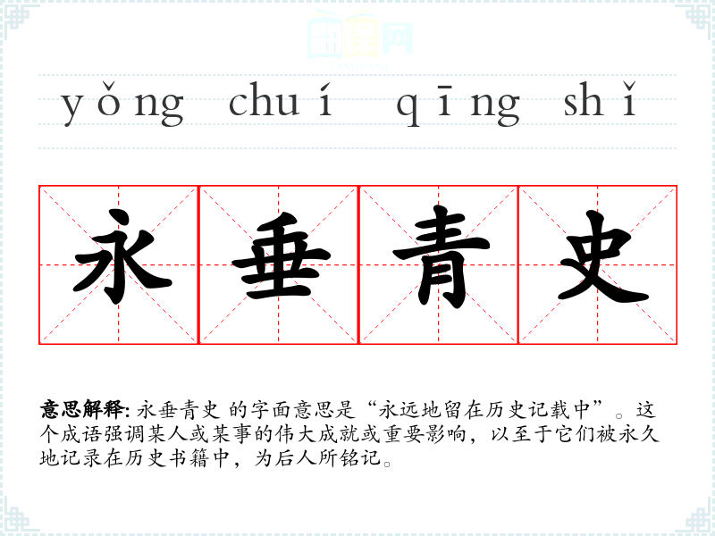 永垂青史 的字面意思是“永远地留在历史记载中”。这个成语强调某人或某事的伟大成就或重要影响,以至于它们被永久地记录在历史书籍中,为后人所铭记。