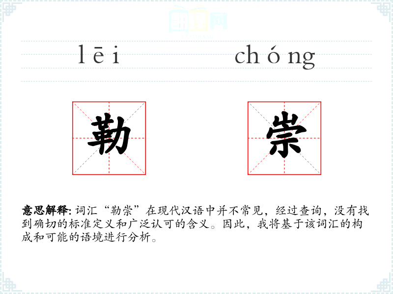 由于“勒崇”不是一个标准词汇,我们无法提供确切的基本定义。但从字面上看,“勒”可能与约束、限制有关,“崇”则通常表示尊敬、崇拜。结合来看,“勒崇”可能指的是对某事物或某人的尊敬和崇拜,同时带有一定的约束或限制。