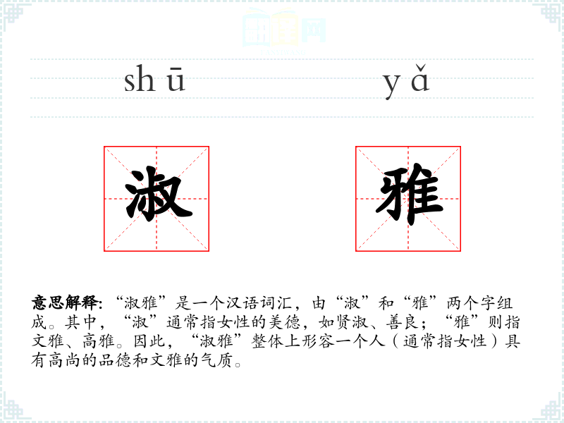 “淑”字最早见于《诗经》,原意为清澈、纯净,后引申为美德。“雅”字则源于古代的“雅言”,即官方标准语言,后逐渐演变为文雅、高雅之意。两个字结合,形成了“淑雅”这一复合词,用以形容人的内外在美。