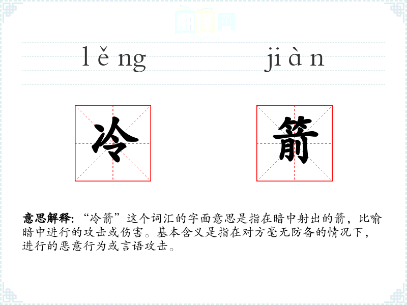 “冷箭”这个词汇的字面意思是指在暗中射出的箭,比喻暗中进行的攻击或伤害。基本含义是指在对方毫无防备的情况下,进行的恶意行为或言语攻击。