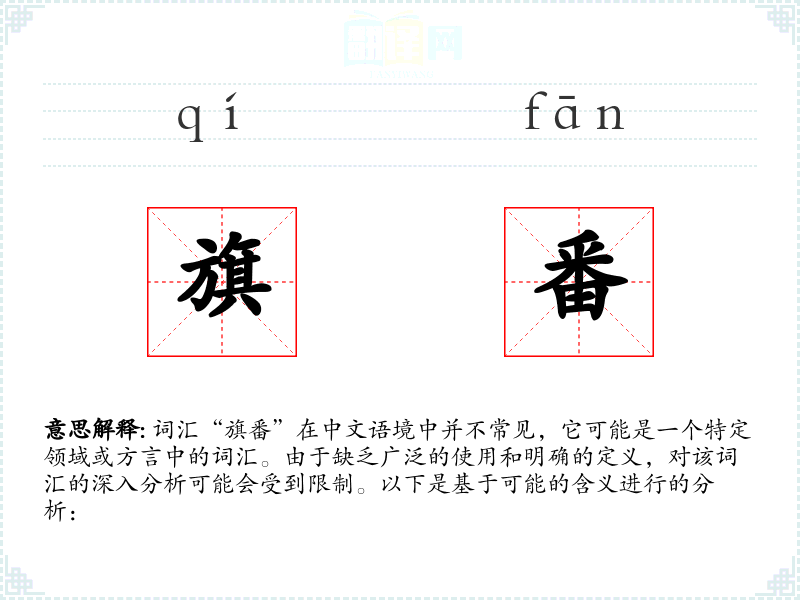 “旗番”可能是由“旗”和“番”两个字组合而成。其中,“旗”指的是旗帜,“番”在古代可能指代编号或次序。这个词可能在特定的历史时期或地区被创造并使用。