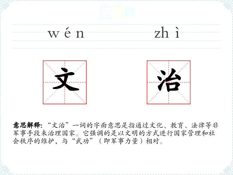 “文治”一词的字面意思是指通过文化、教育、法律等非军事手段来治理国家。它强调的是以文明的方式进行国家管理和社会秩序的维护,与“武功”(即军事力量)相对。