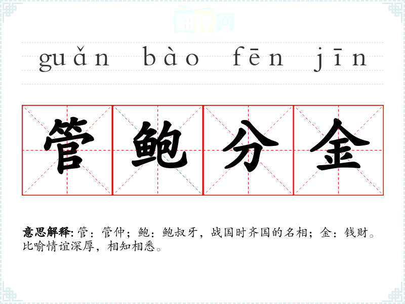 管:管仲;鲍:鲍叔牙,战国时齐国的名相;金:钱财。比喻情谊深厚,相知相悉。